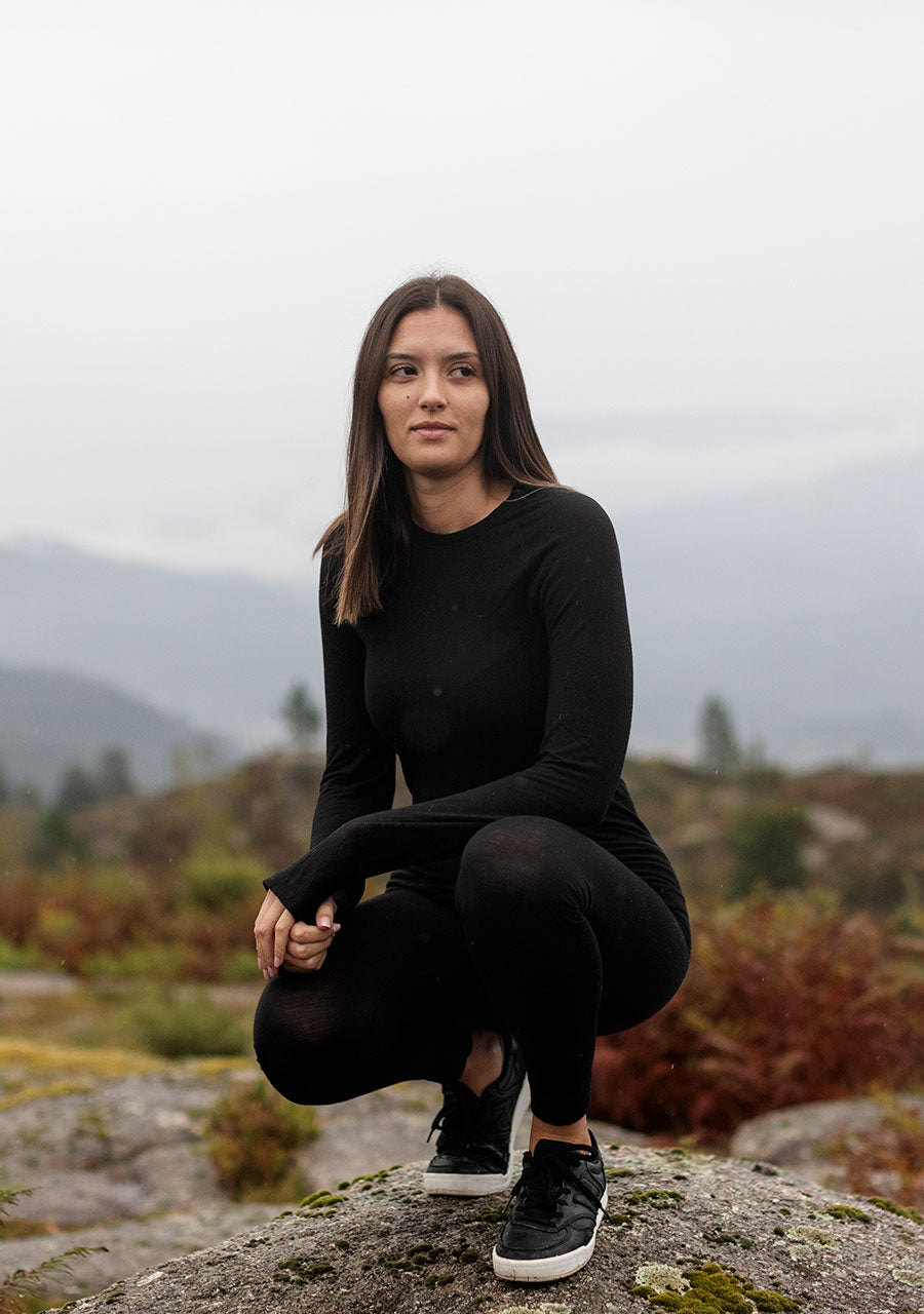 The touch and feel is just as in our current collections, because the inner layer of the thin and lightweight knit is ECONYL® yarn and the outer layer is merino wool.